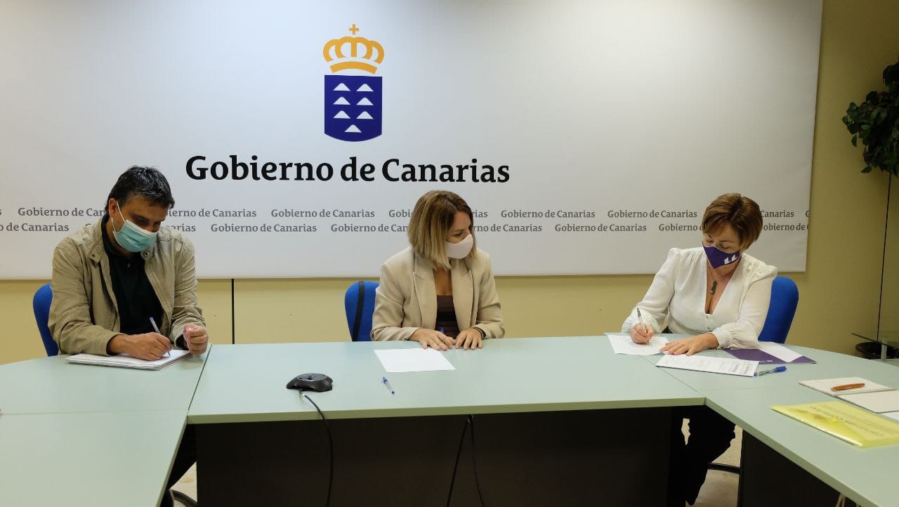 Noemí Santana, consejera de Derechos Sociales, Igualdad, Diversidad y Juventud del Gobierno de Canarias, y Rosa Aguilar, rectora de la Universidad de La Laguna, suscriben el convenio a partir del cual se desarrollará el “Programa de intervención para la gestión estratégica de la (in)migración y la promoción de la convivencia intercultural en Canarias” (Canarias Convive). Estuvieron acompañadas por Javier Bermúdez, director general de Derechos Sociales e Inmigración, y Vicente Zapata, director del programa Canarias Convive, además de los equipos técnicos del Gobierno de Canarias y la Universidad de La Laguna que tienen la responsabilidad de su ejecución.
