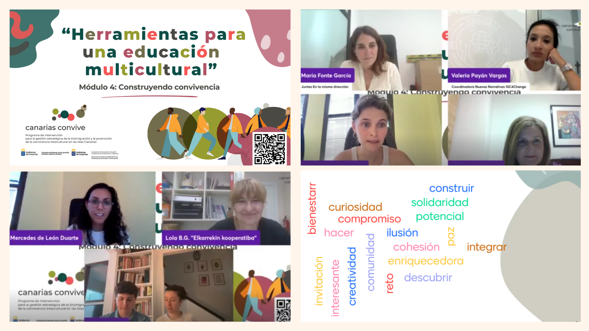 La formación con una marcada metodología práctica ha supuesto una oportunidad para profundizar en diferentes herramientas y experiencias que faciliten a s profesionales el desarrollo de acciones de intervención específicas en las aulas. En concreto, el módulo 4, se ha centrado en potenciar el conocimiento de experiencias y buenas prácticas aplicadas al ámbito educativo con el objetivo de reflexionar y dialogar sobre la importancia de fomentar la convivencia intercultural y la prevención del racismo y la xenofobia en los centros educativos.