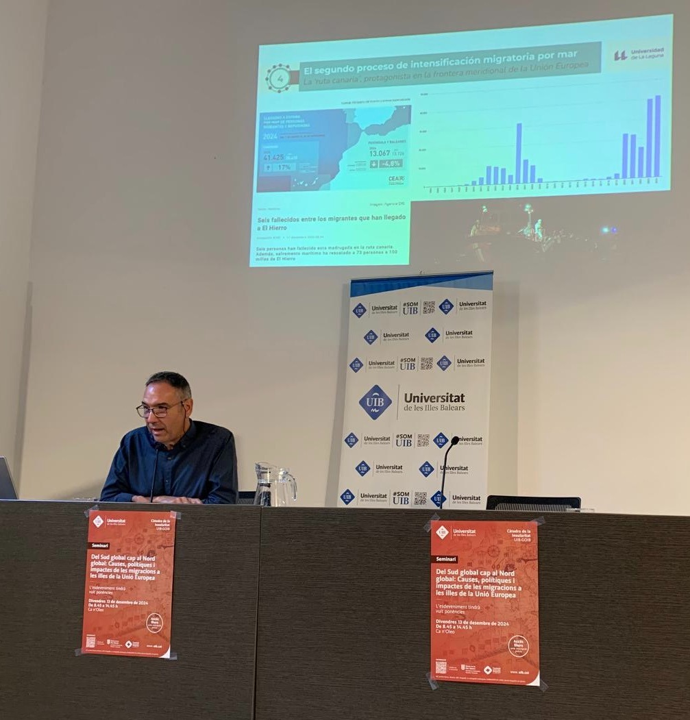 El pasado 13 de diciembre de 2024, Vicente Zapata, director académico del Programa Canarias Convive, fue invitado a participar como ponente en el seminario «Del Sur Global hacia el Norte Global: Causas, políticas e impactos de las migraciones en las islas de la Unión Europea», organizado por la Cátedra de la Insularidad de la Universidad de las Islas Baleares (UIB) en el espacio Ca n’Oleo de Palma de Mallorca. Este evento reunió a personas expertas y académicas para debatir sobre los retos que las migraciones suponen para las islas europeas.